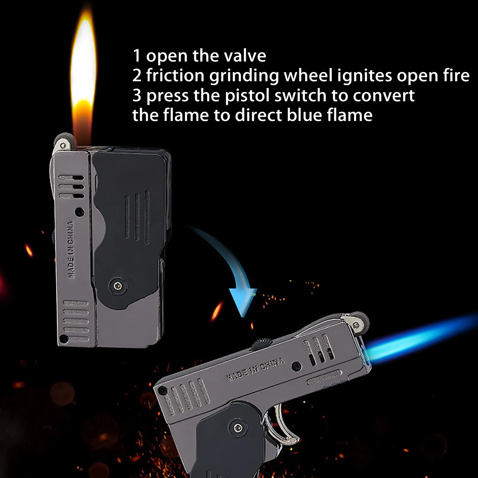 Advanced material stylish design: Sturdy high-grade alloy guarantees durability and long life. The lighter. which comes in two variants. a pistol and a square fold and deform. is more comfortable to fit in your hand.